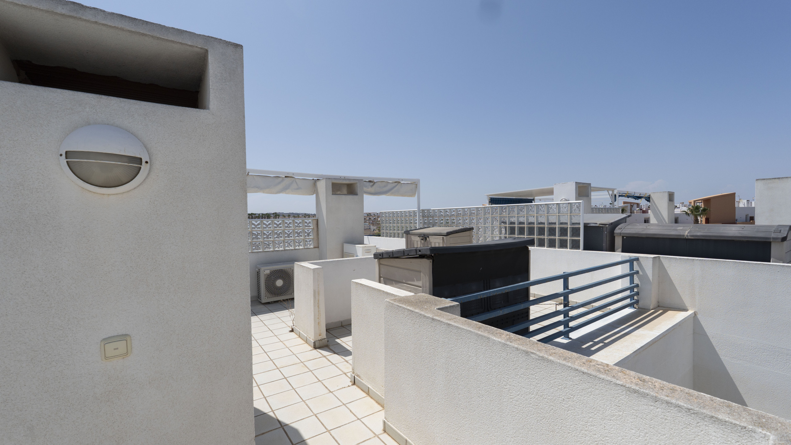 El bungalow cuenta con una terraza y unas escaleras que llevan al gran solarium, el cual está equipado con todo lo necesario para disfrutar de fantásticas cenas. El salón es de gran tamaño y está al lado de la cocina, la cual es semi independiente. Dispone de dos baños, uno de ellos en suite.