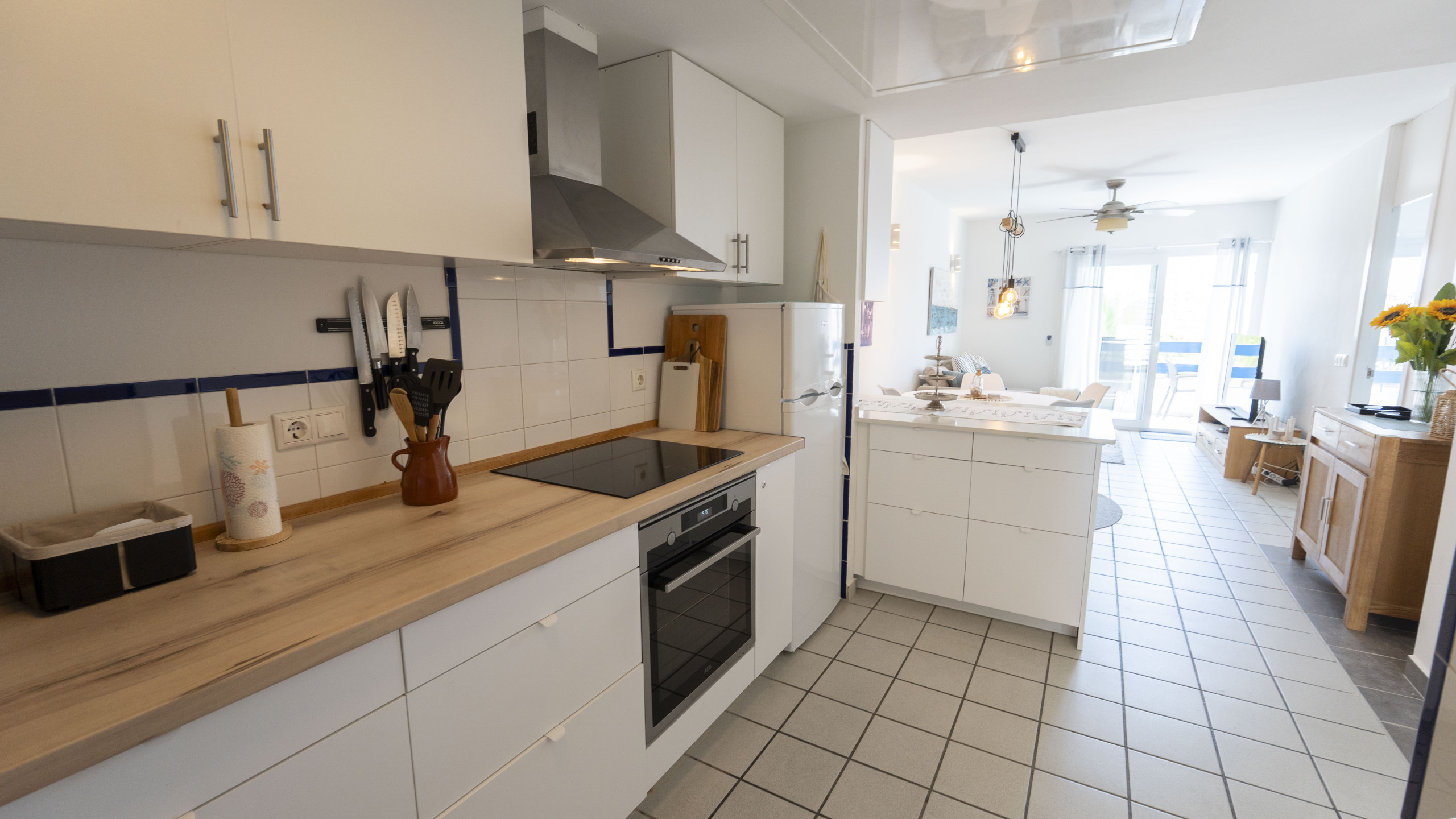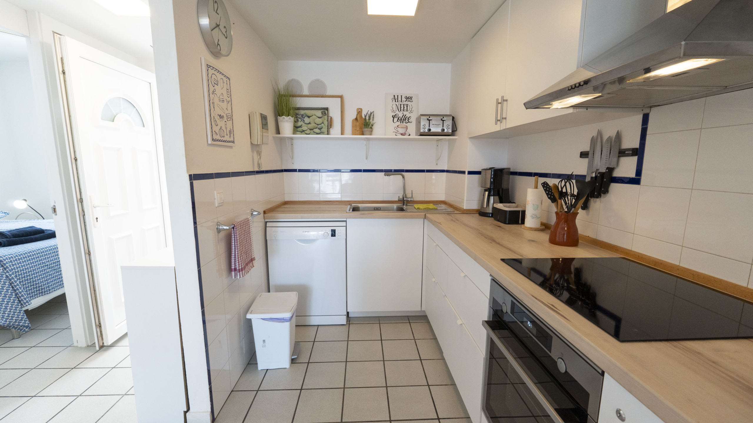 La cocina americana, de inducción, está equipada con nevera, microondas, horno, congelador, lavadora, lavavajillas, vajilla/cubertería, utensilios/cocina, cafetera, tostadora y hervidor de agua.