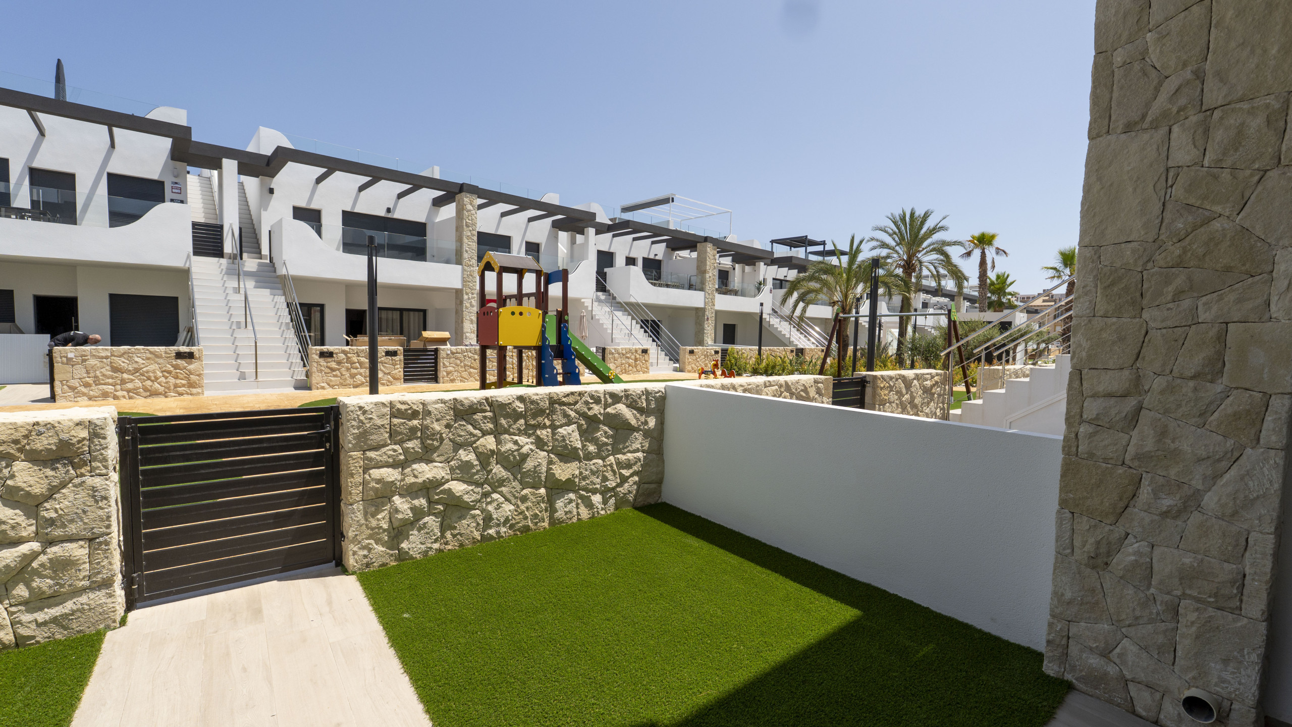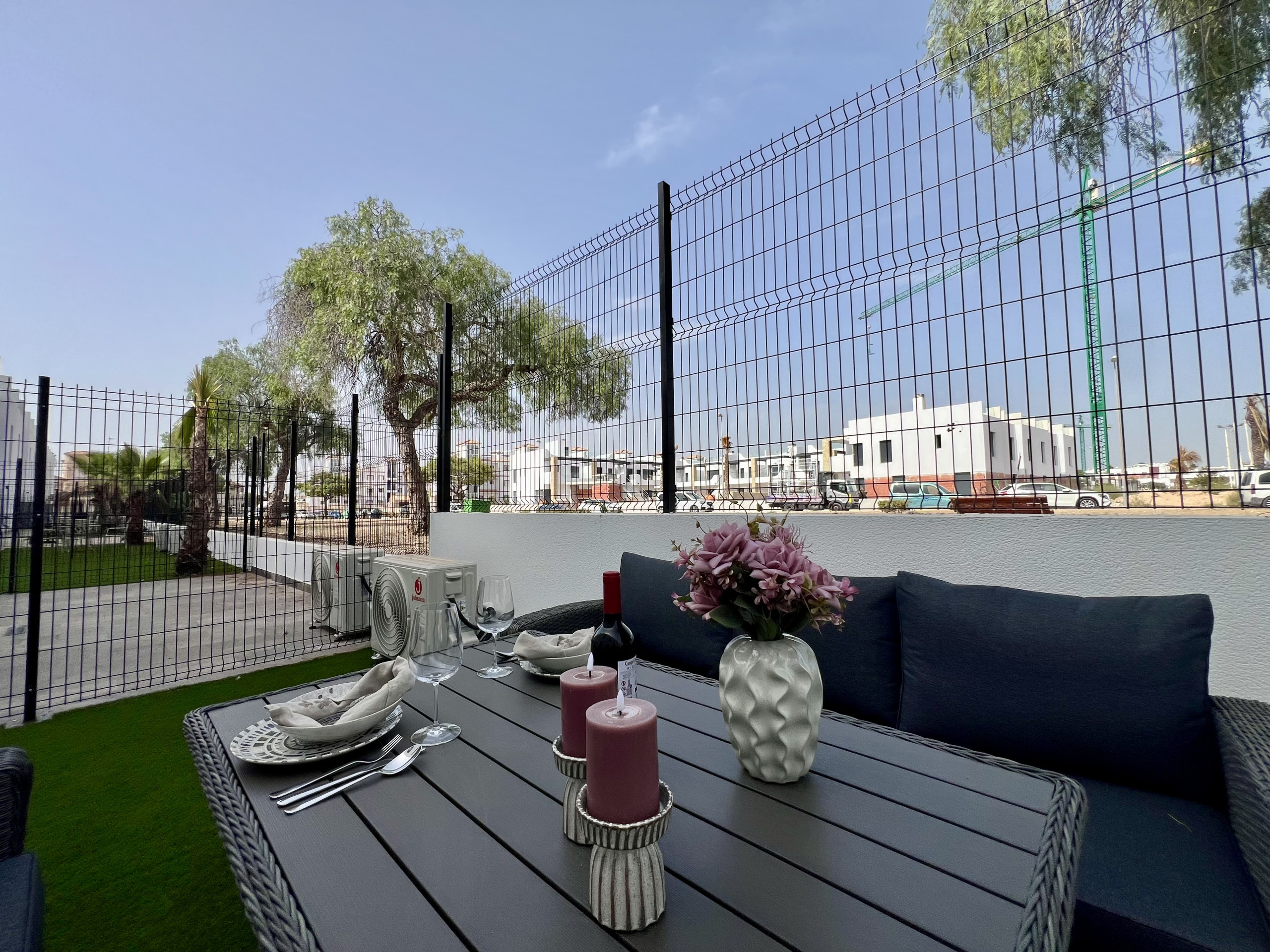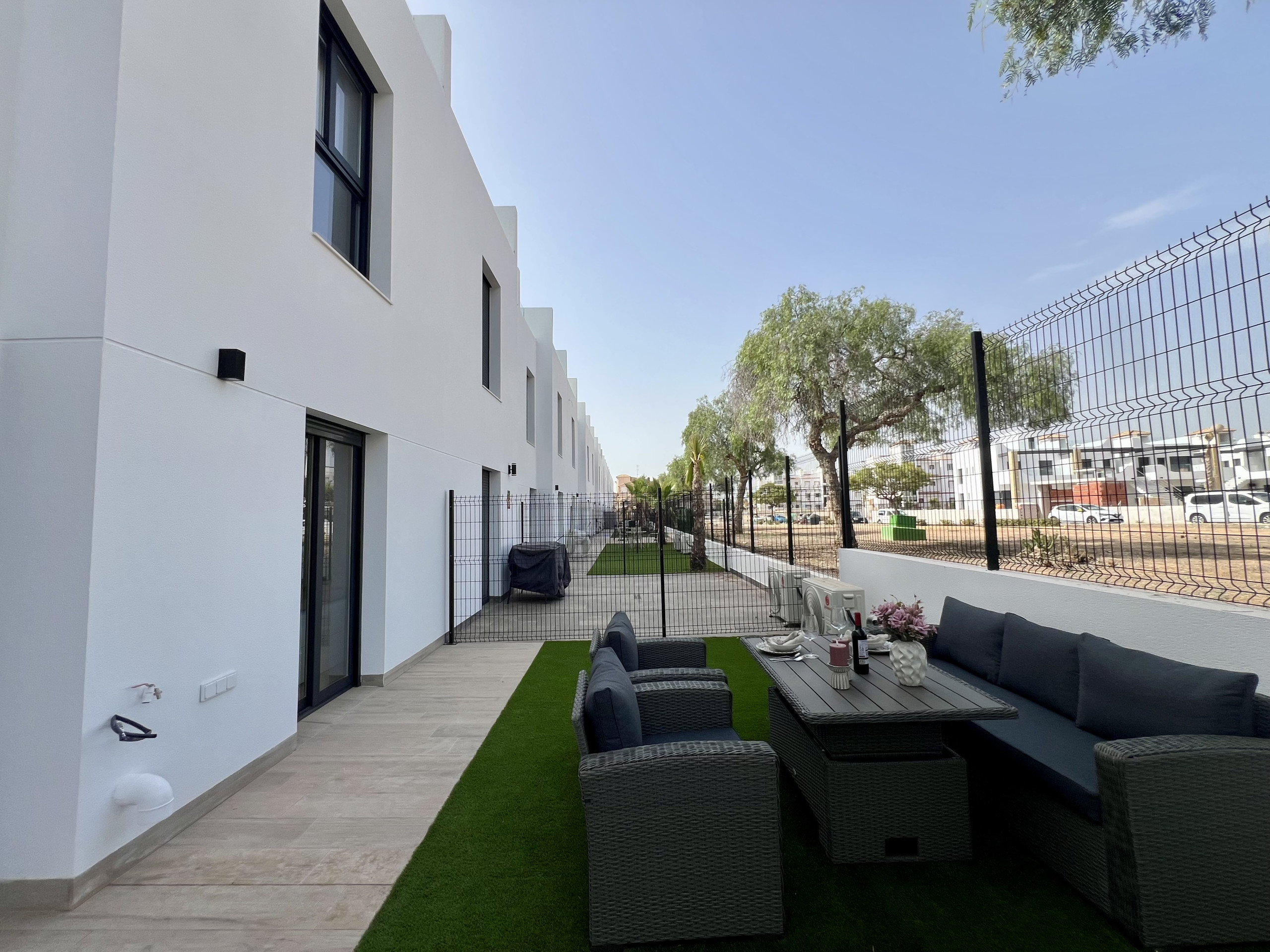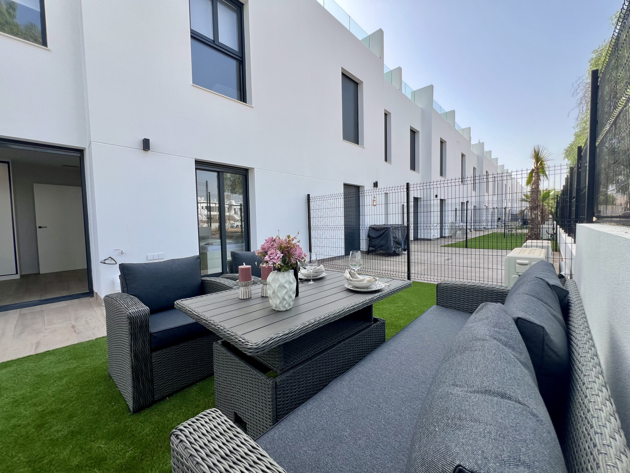 Dispone de jardín, mobiliario jardín, parcela vallada, lavadora, zona infantil, gimnasio, spa, calefacción bomba de calor, aire acondicionado, piscina comunitaria+infantil, 1 Televisor.