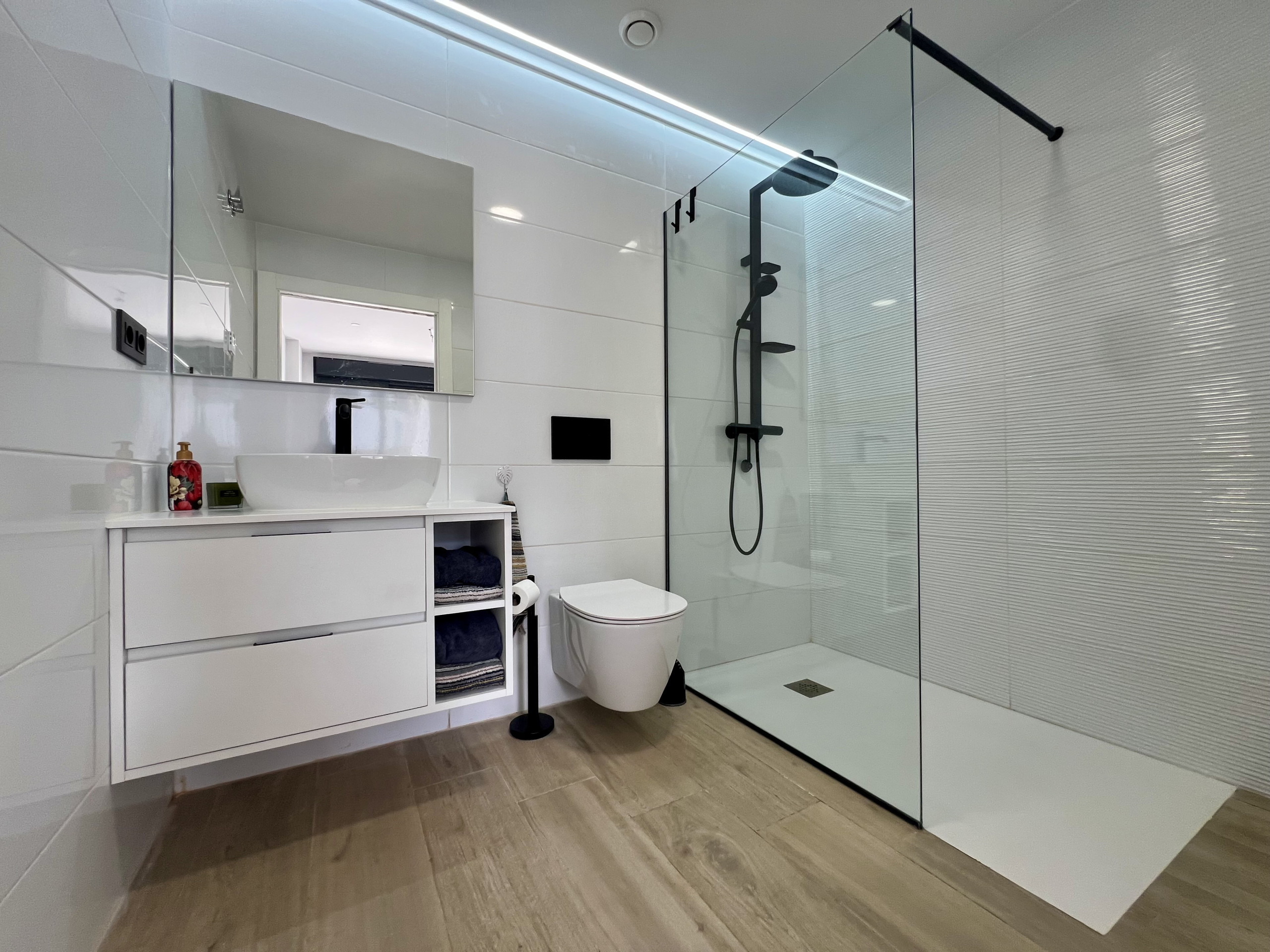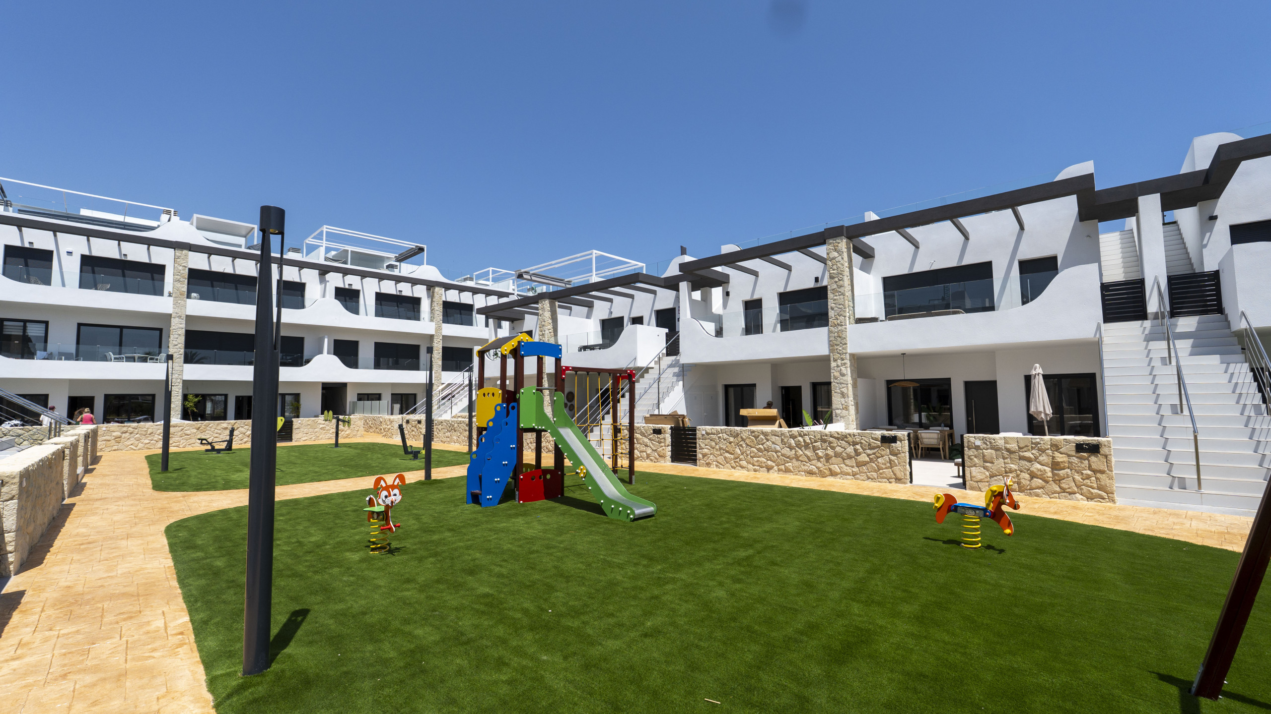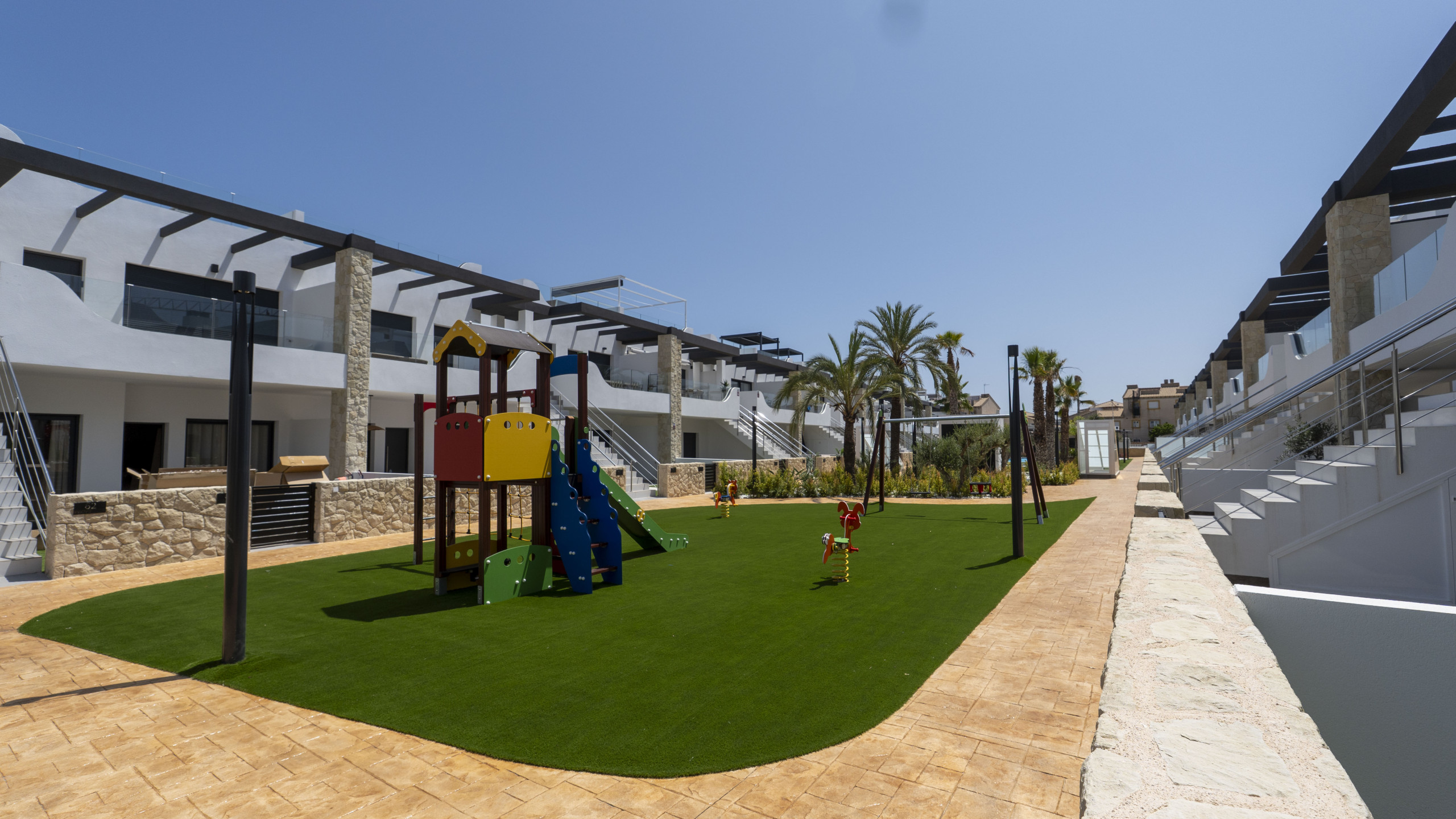 Boligen er utstyrt med følgende hage, hagemøblement, inngjerdet tomt, vaskemaskin, lekeplass, treningsstudio, spa, varmepumpe, air condition, svømmebasseng felles barnebasseng, 1 TV.