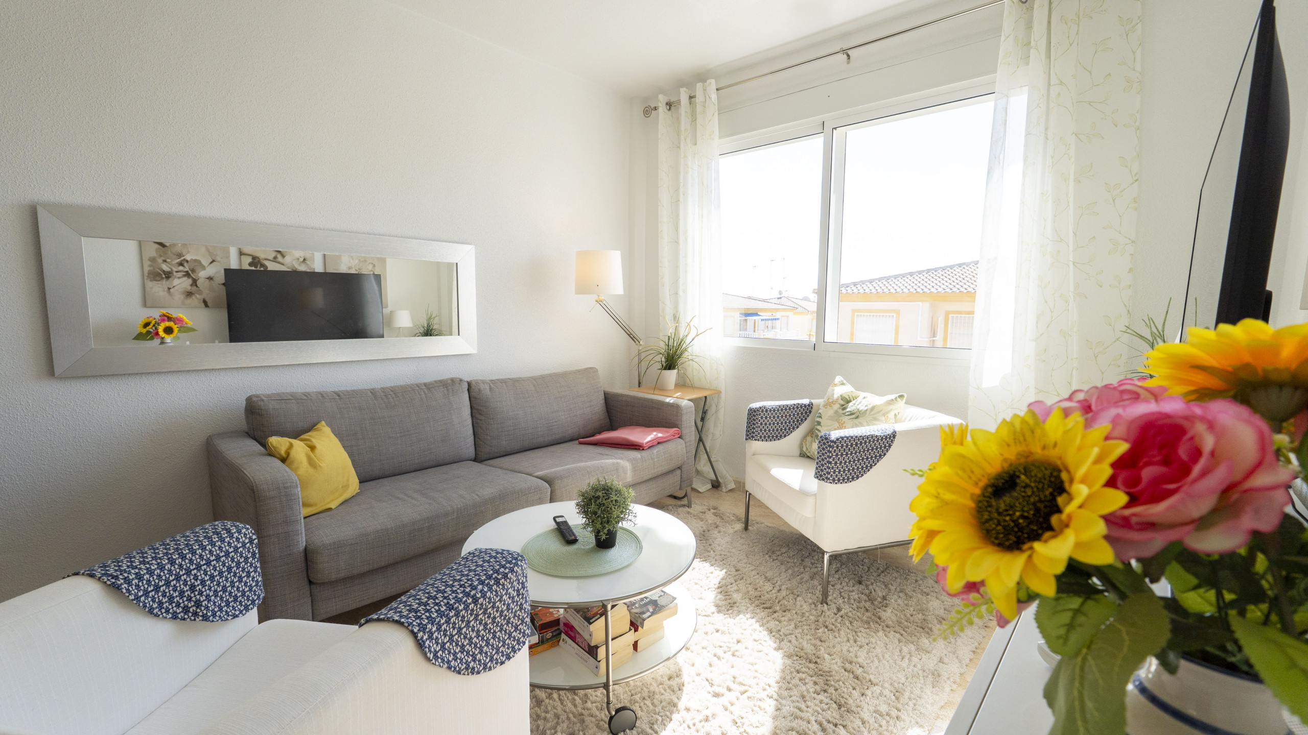 Bright and cozy second-floor apartment in a quiet, gated community, southeast-facing with sun from morning until sunset. The apartment offers 2 comfortable bedrooms, 1 bathroom, and an open-plan kitchen–living area. Air conditioning in all rooms and available for stays of 11 days or more.