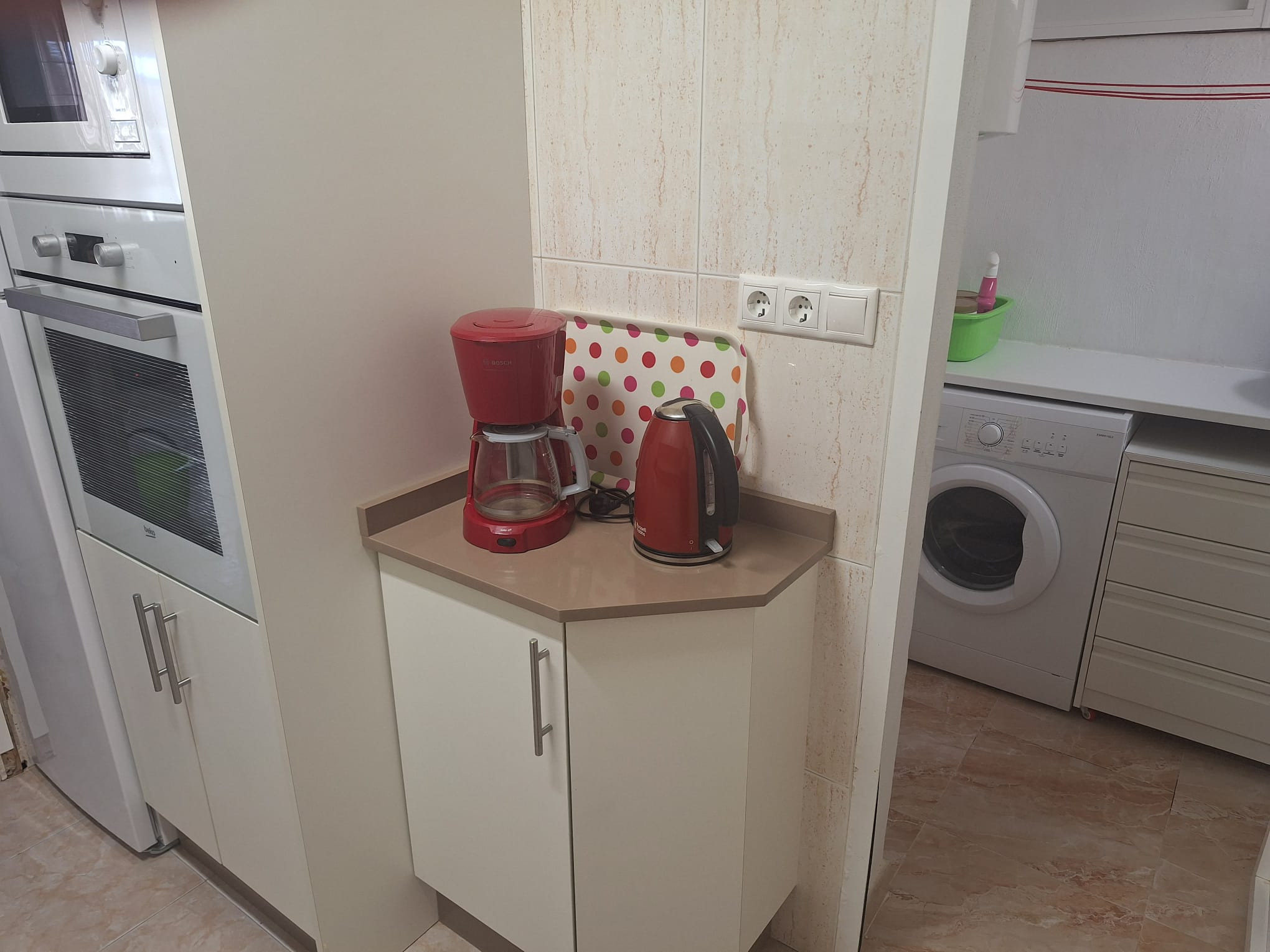 the kitchen, refrigerator, oven, freezer, dishwasher, dishes/cutlery, kitchen utensils, coffee machine and kettle are provided.