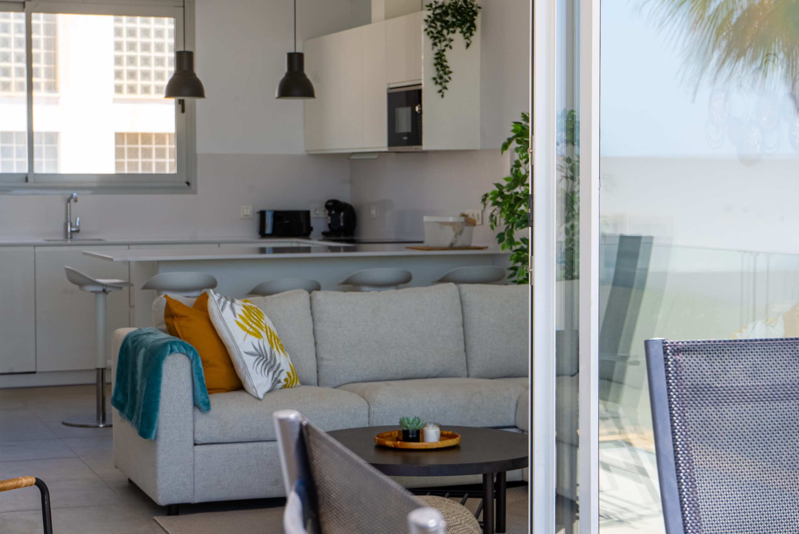 This immaculately presented townhouse has 4 bedrooms and capacity for 8 people. As you walk in to property you are greeted with a short hallway, on the right hand side you will find open plan kitchen with a bar and the living area. Just off the living area you have access to nice large terrace with views of the communal pool, the communal gardens and the even the sea. Also at this level there is a toilet/washroom. As you go down the stairs the subterranean level you will find 3 spacious bedrooms and two bathrooms, one of them being ensuite. From the ground level you also have access to stairs leading the upper level, where you will find one further bedroom, also nice and spacious, a seating area and another full bathroom.